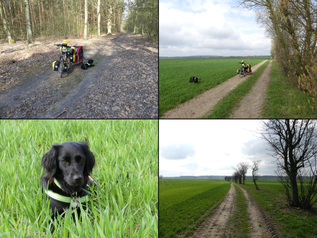 Die Freude über die wieder erreichte Asphaltstraße ist jedoch nur kurz. Erneut geht es über einen Feldweg. Der Blick ist malerisch. Das Wetter ebenso. Schnell die Kamera rausgeholt und ein, zwei Bilder gemacht. Lotte lässt sich unterdessen im Gras nieder und genießt die kurze Pause.