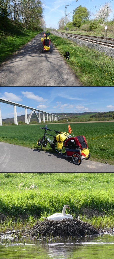 Kurz vor Guxhagen habe ich dann wirklich noch einmal einen Berg vor mir, der zum R1 gehört. Hier kommen dann auch die großen Schlaufen im Flusslauf. Immer wieder tauchen Brücken auf, die einen die Wasserseite wechseln lassen. Es ist fast schon lästig. Links, rechts, vor, zurück. Nein, quatsch. Aber wenn man sich mal für eine Seite entscheiden könnte. Der Weg an sich ist toll! Die Schwäne brüten im Uferbereich. Die Blesshühner spaddeln über die Fulda und ich schiebe meinen Tross über die Brücken.