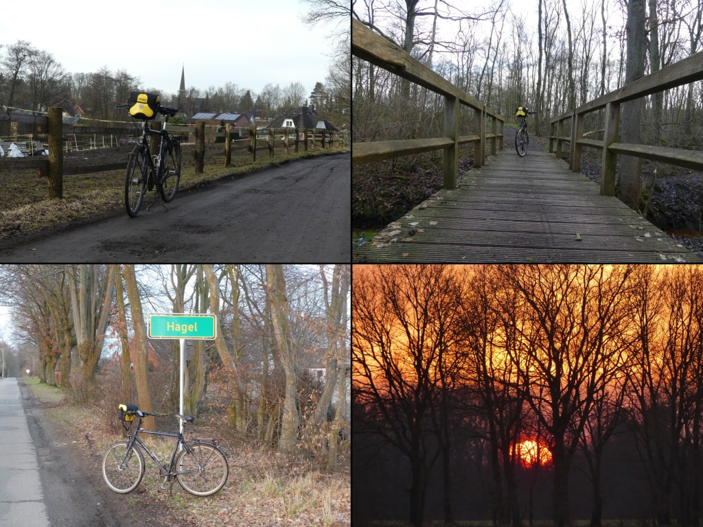 Da hinten stehen Leute, die Frage ich mal schnell und bekomme verstörte Blicke. Kennen sie nicht. Ey, ihr seid es, die hier wohnen. Das ist euer Nachbardörfchen! Keine Ahnung bekomme ich zur Antwort. Das ist ja geil, denke ich. Was dann allerdings dem Fass den Boden ausschlägt, ist, dass keinen Kilometer weiter das Schild von »Hagel« auftaucht. Ziel erreicht! Jetzt kann es langsam nach Hause gehen. Schnell noch ein Bild vom Sonnenuntergang gemacht und dann drauf los. Willst du unterwegs noch Pause machen, überlege ich. Klar! Also halte ich in Helmste an und setze mich in den Eichenhof.