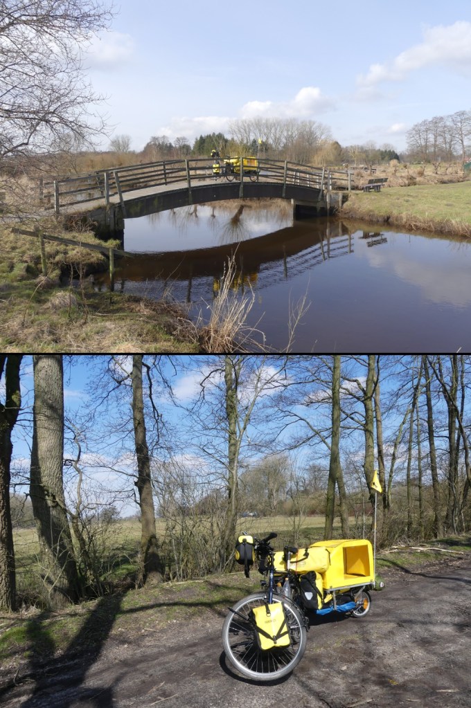 So komme ich durch meine unnütze Spielerei erst am Ostermontag los. Aber ein Gutes hat es auch. Das Wetter ist herrlich! Die Sonne scheint, die Blümchen blühen, die Vöglein zwitschern. Dadurch dass ich aber einen Tag verloren habe, möchte ich gleich das Ziel, der eigentlich heutigen Etappe anfahren. Oyten bei Bremen. Sind ja nur knappe achtzig Kilometer. Mit einem Einradanhänger, den du noch nie getestet hast, mit dem der Hund noch nie gefahren ist. Du bist echt ein Fuchs, was deine Entscheidungen betrifft. Aber egal. Denn vorwärts komme ich fast wie von alleine. Die Kette surrt, die Hundemarke klimpert. Man kann dem Hund regelrecht anmerken, dass er Bock hat. Nicht nur einmal muss ich Lotte ermahnen, dass sie nicht so ziehen soll. Das Fahrgefühl mit dem Anhänger ist, zumindest stellenweise nicht das Beste. Dabei hat der Hund noch nicht mal drinnen gesessen.