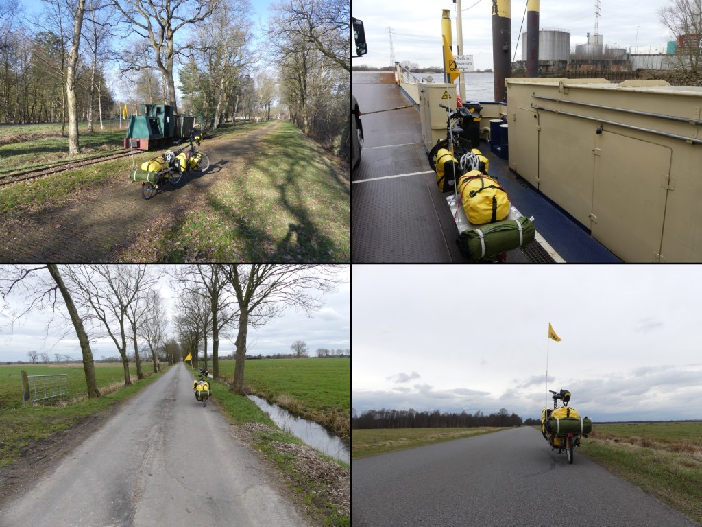 Mit gemächlichem Tempo baue ich alles ab und verstaue es wieder am Fahrrad bzw. dem Anhänger. Zu guter Letzt noch die Übernachtung auf dem Campingplatz bezahlt und weiter. Dreißig Kilometer sind es bis Bremen, Farge. Dort, wo ich mit der Fähre über die Weser übersetzen möchte. Eigentlich wollte ich weiter nördlich, doch die Leute am Vorabend in der Wirtschaft sagten, ich solle die Verbindung Farge – Berne nehmen. Es sei dichter und außerdem könnte ich mit dem Jadebusen in Konflikt kommen, wenn ich den Weg zu weit nördlich ansetze. Zetel ist das angepeilte Ziel. Also nehme ich den Tipp an, doch weiter südlich zu radeln.