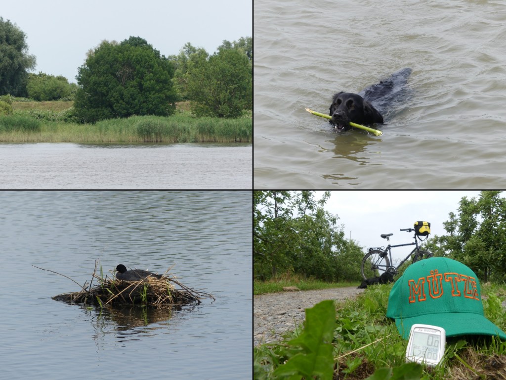 Mit dem nassen Hund geht es dann in den Rüstjer Forst. Mitten durch den Wald schlage ich den Weg nach Horneburg ein. Dort gibt es auch für mich eine Pause. Im »Belmo« lasse ich mich nieder, ehe es schließlich langsam Richtung Heimat geht. Lotte bekommt noch zwei Mal die Möglichkeit zum Schwimmen. Bei der zweiten Anlaufstelle erblicke ich ein Blesshuhn. Es hockt auf seinem Nest und brütet die nächste Generation aus. Lotte interessiert das mal so gar nicht. Zum Glück. Sie paddelt einfach nur im kühlen Nass umher. Immer in Ufernähe.