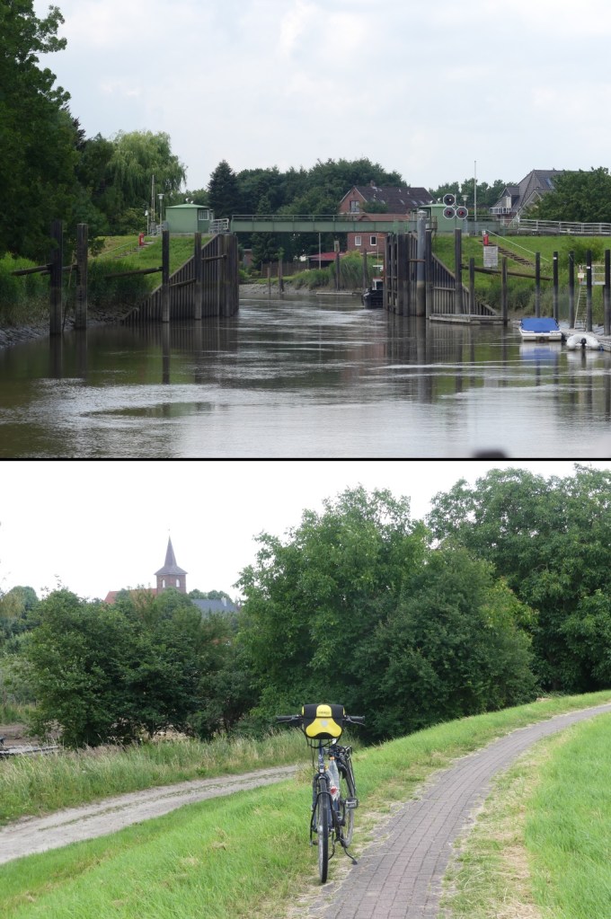 Fühlen tue ich mich gerade wie in der Achterbahn. Denn auf diesem Abschnitt gibt es sehr viele Deichdurchbrüche, die zu den Häusern mancher Anwohner führen. So rausche ich immer wieder den Deich abwärts und hinter der Einfahrt aufwärts.