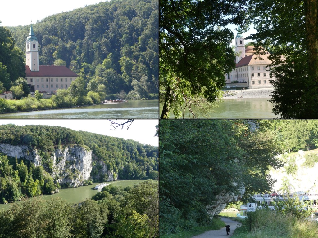 Lotte gönnt sich unterdessen eine Abkühlung. Das Wetter ist gigantomanisch! Das Kloster selbst platzt fast aus allen Nähten. Eine solche Menschenmasse habe ich hier so noch nicht gesehen. Die Kellner und Kellnerinnen bringen mit großen Tablets das Essen aus der Klosterküche. Das aus der eigenen Brauerei gebraute Dunkelbier schwappt in den Krügen. So stärke ich mich erst einmal. Durch die Massenabfertigung, die hier stattfindet, wartet man seltenst lange auf sein Essen. Das spielt mir geradezu in die Karten. Also eilig den Bauch vollgeschlagen und dann auf das andere Donauufer. Lotte hat einen Haxenknochen bekommen und trägt diesen stolz, wie Oskar spazieren.