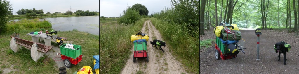 Anderthalb Stunden später ist es dann endlich so weit. Ich bin unterwegs. Der Anhänger rumpelt über die Straße. Der Hund mit seinem Rucksack läuft voraus. Es ist noch kein Kilometer gelaufen, da geht mir der Handwagen bereits auf den Keks. Ich ziehe ihn. Das macht sich in den Handflächen bemerkbar. Wie soll ich so die nächsten elf Tage durchstehen? Was wären die Alternativen? Ein Rucksack von der Größe, den ich nicht habe. Ein bedeutender Teil der Ausrüstung müsste dann zu Hause bleiben. Kein Schreiben von unterwegs. Und sonst? Entweder schmerzende Handflächen oder aber Rücken. – Nimm die Handflächen, denke ich und trotte weiter.