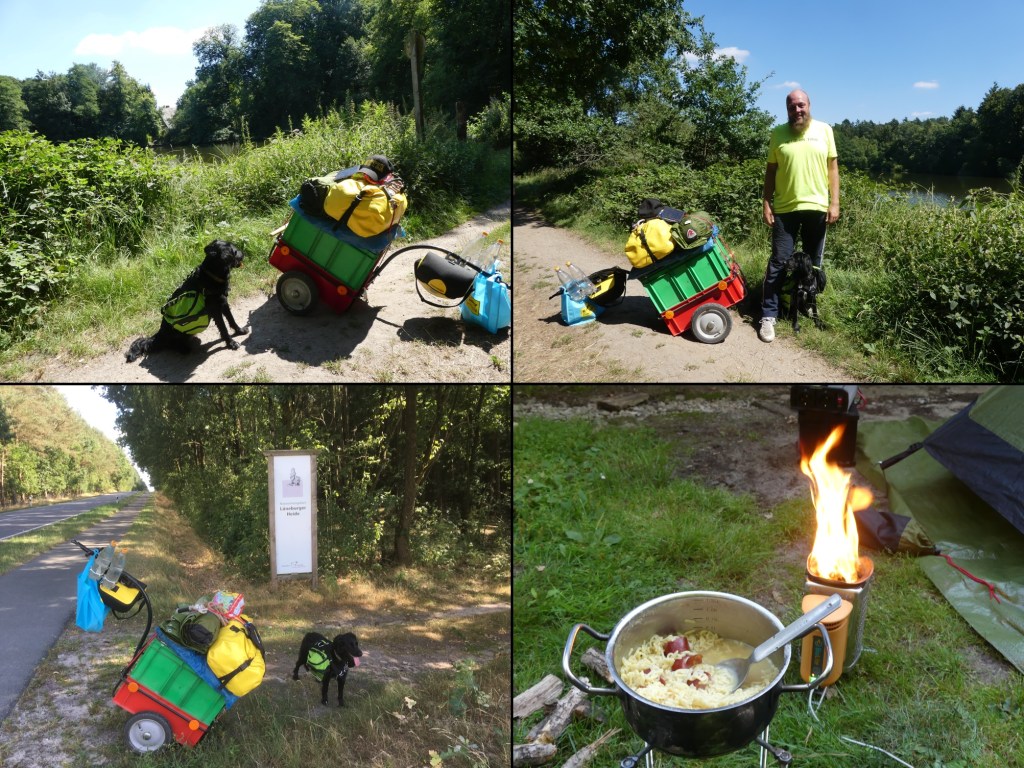 Nachdem das Zelt aufgestellt und die Luftmatratze aufgepustet ist, sammel ich etwas Bruchholz von den angrenzenden Eichen. Nudeln mit Brühe sollen es heute werden. Cabanossiwurst schneide ich noch mit hinein. Festmahl! Lotte, die ich zuvor zum Schlafen ins Zelt geschickt habe, fängt das Winseln an. Sie möchte noch einmal raus. Da entdecke ich das Malheur. Mein Hund humpelt auf der linken Vorderpfote. Jetzt sind wir zwei Fußkranke. Ich entscheide mich aber doch, bis Morgen abzuwarten. Den Hund abholen lassen kann ich dann auch noch.