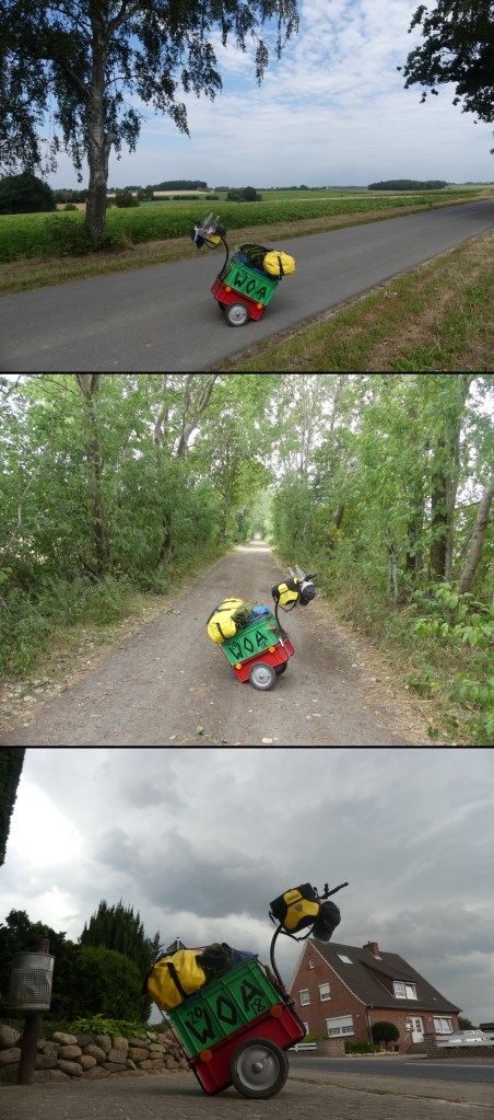Die Wirtin ist so angetan von meinem Vorhaben, dass sie gerne mitkommen würde. Ob ihr Feldbett auf meinen Anhänger passe. Ich verneine. Die Dinger sind schwer. Wer mitmöchte, muss seinen Kram selber schleppen, oder eben rollern. Also gehe ich alleine weiter. Ohne Karte, das noch zusätzlich, nach Wacken laufen, hat auch keinen wirklichen Reiz. So tingel ich, nachdem sich die Wetterlage beruhigt hat, alleine weiter. Aber nicht um vorher noch etwas vom Kuchen abzubekommen, der bei der Geburtstagsfeier übrig geblieben ist. Danke nochmal dafür.