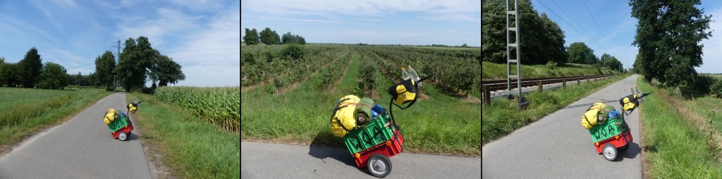Unterhalb der Autobahnbrücke kurz vor Stade gönne ich mir nochmal eine Konserve Vitamine. Unser Postbote kommt mit seiner Frau vorbei, die gerade ihre sonntägliche Fahrradtour machen. Hier im Schatten lässt es sich gut aushalten. Ein leichter Wind zieht hindurch. In habe einfach keine Lust mehr zu laufen. Ich könnte mich hier irgendwo in die Obstplantagen werfen mit meinem Zelt. Wen soll das hier stören? Letztendlich rollen die Räder meines Handwagens weiter. Laufen meine Füße Schritt für Schritt. Meter für Meter. Entlang der Hauptstraße. Einer viel befahrenen Hauptstraße. Eigentlich ist es die Hauptverkehrsader von Stade in Richtung Kehdingen. Ein wenig vermisse ich die Abgeschiedenheit der Heidewege. Den Sand vermisse ich dagegen nicht. Aber die Ruhe.