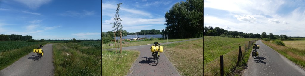 Wie dem auch sei. Ich erreiche Bremervörde und entdecke heute den Wegweiser, den ich vor zwei Wochen verfehlt habe. Ich bin auf dem Oste-Radweg. Darf nun den Vörder-See entlang fahren und bin schließlich am Ostedeich. Was ein geiles Fahren. Es ist gigantisch hier. Es erinnert ein wenig an den Elberadweg. Also, Richtung Artlenburg, Neu Darchau. Rechts von mir der Deich und dahinter die Oste. Links von mir Wälder und Felder. Die Sonne scheint von oben herab und lässt die Wiesen in einem satten Grün erstrahlen. Wie eine Schlange winden sich Deich und Straße am Flusslauf entlang.