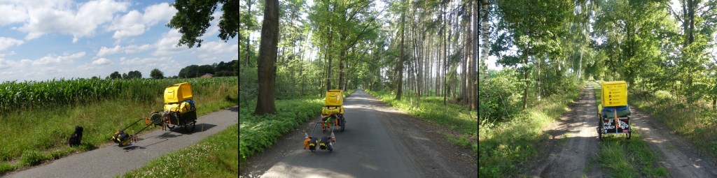 Zur Mittagsstunde rollt mein Wagen dann von seiner Einfahrt. Scheeßel ist das nächste größere Ziel. Zwischenziel. Nicht das Ende der Etappe. Das soll, wenn alles glatt geht, irgendwo bei Brockel sein. Im Vorwege habe ich mich mit Rolf kurzgeschlossen, dass ich wohl die etwas längere Strecke über Appel nehmen werde. Die soll idyllischer sein, weil Wirtschaftswege. Doch als ich über die ersten Meter rumpel, missfällt mir die Idee. Ich habe zwei Spuren von Betonplatten. Mein Wagen ist zu breit für diese und pumpelt über die Grünstreifen. So schüttelt es mich bei jedem Schritt durch. Nein, das ist doof. Sicher werde ich im Laufe der Tour noch auf solche Pfade stoßen, doch jetzt gerade habe ich da keine Lust drauf. Ich kämpfe noch immer mit diesem ollen Muskelkater der Vortage. Da möchte ich unnötige Schmerzimpulse vermeiden. Also zurück zur Hauptstraße. Es hat auch Vor- und Nachteile. Vorteil? Ich habe einen Fahrradweg und mit dem Verkehr habe ich Menschen, die auf meine Tour aufmerksam werden. Das hätte ich über die Wirtschaftswege sicher nicht so sehr gehabt. Nachteil ist der Verkehr. Es ist halt nicht so idyllisch. Egal. Es sind potenzielle Leser meiner Geschichten.