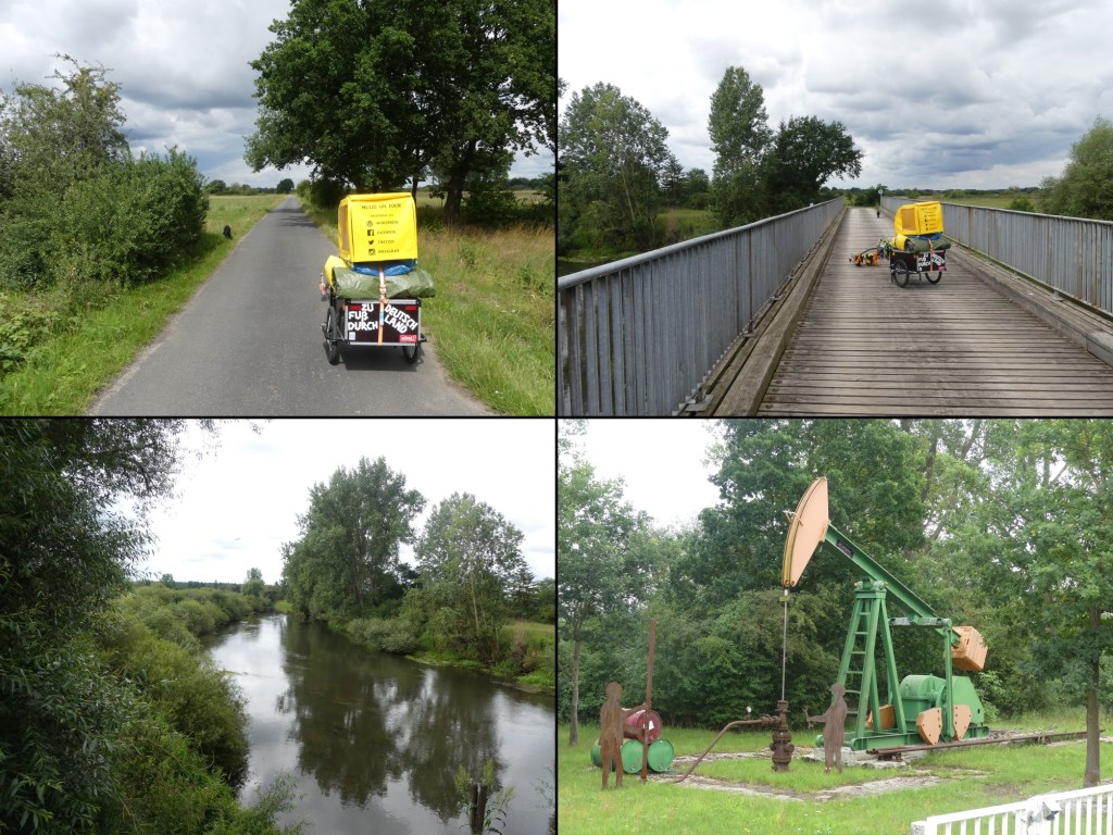 Zum Ortsausgang hin hält dann ein weiteres Fahrzeug neben mir. Ein Schaustellerpärchen ist auf meinen Wagen aufmerksam geworden und möchte mehr erfahren. Bereitwillig gebe ich Auskunft. Wo ich schlafen möchte? Ich weiß es noch nicht. Ich müsste nach Möglichkeit aber auch noch fünfzehn Kilometer reißen. Damit würde sich die derzeitige Entfernung zu Hannover Garbsen in etwa halbieren. Das möchte ich auf jeden Fall noch schaffen. So trennt man sich wieder.