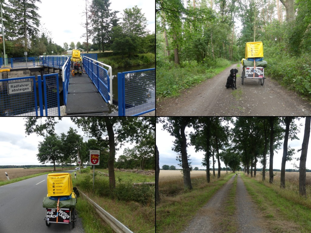 In Schwarmstedt mache ich eine etwas größere Pause an einer Bushaltestelle. Da hält ein großer Wagen und eine ältere Dame steigt aus. Die drückt mir einen Obolus für meine Reise in die Hand. Für den Hund sind ihre Worte. So schnell, wie sie aufgetaucht ist, ist sie wieder verschwunden. Verdattert blicke ich dem Wagen hinterher. Das soll einer begreifen.