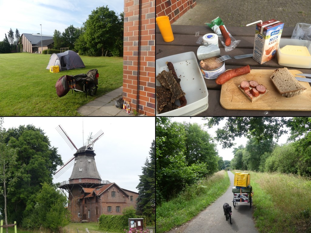Am Bahnhof Brockel verlasse ich die Hauptstraßen für eine längere Zeit. Ich lande auf dem Radfernweg »Hohe Heide«. Ein einem Wort? GEIL! Der Weg hat alles, was ein Wander- oder Radlerherz verlangt. Er ist nur so breit, wie der Fahrradweg an der Straße. Asphalt so glatt wie ein Kinderpo. Ein Spalier aus Laubbäumen und dahinter weite Felder. Getreide, Mais oder Futterweisen. Auf der Brücke über der »Wiedau« begegne ich einem älteren Herren und dessen Enkel, die »Boote« treiben lassen. Eigentlich wirft der Knirps nur Stöckchen ins Wasser. Aber in seiner Welt sind es Boote. Kinderfantasie. Herrlich. Nach kurzem Gespräch werde ich gefragt, ob ich alles hätte. Genug Geld? Essen? Ich bestätige, dass es mir an nichts fehlt. Bekomme aber einen Obolus für meine Reisekasse. Völlig verrückt! Artig, wie es sich gehört, bedanke ich mich und ziehe weiter. Lotte hat unterdessen ein Bad genommen. Damit der Muff aus ihrem Fell endlich verschindet. Nun läuft sie freudig voran und hinterlässt nasse Spuren auf dem Asphalt.