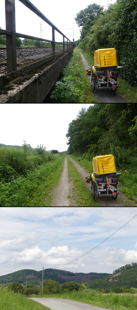 Also raus und ab auf die Straße. Wobei es schmalen Schotterweg eher trifft. Ich laufe heute viele Kilometer an Bahngleisen entlang. Mal nur als schmaler Pfad, aber auch als Wirtschaftsweg mit zwei Spuren, dass ein Auto hier fahren kann. Gefühlt alle fünf Minuten rauscht ein Zug an mir vorbei. Man hat mir erklärt, dass das hier eine der Haupttransitstrecken ist. Besonders für Güterzüge. Es rumpelt, raucht und poltert jedes Mal, wenn wie einer vorbei kommt. Irgendwie ist es auch interessant. Wann sieht man mal so viele Schienenfahrzeuge? Für Anwohner ist das sicher nicht so spaßig. Aber für mich, der hier auf der Durchreise ist, ist das mal eine Abwechslung.