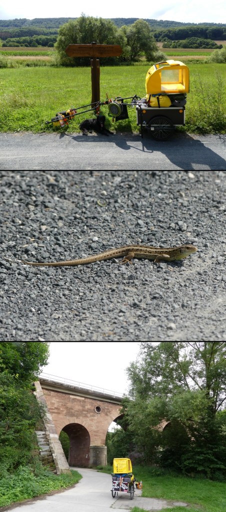 Bei Freden entdecke ich dann eine Bank an einem Bachlauf. Lotte kühlt sich ab und holt sich einen nassen Bauch, das kann ich dann auch. Nur nicht den nassen Bauch. Ich schnappe mir meinen Klappeimer und schaufel mir mit beiden Händen dessen Inhalt auf der Bank sitzend mit Wonne ins Gesicht. Was ein schönes erfrischendes Gefühl. Da hält ein Radreisender neben mir an. Durch das Wasser, das noch über mein Gesicht läuft, blinzel ich mehr, als das ich einen klaren Blick habe. Wenige Sekunden später hat sich das aber gelegt. Der Herr setzt sich neben mir und ich biete ihm etwas von meinem kühlen Nass an. Zwei Hände tauchen in den Eimer. Es platscht und plätschert. Ein freudiges Schnaufen dringt an meine Ohren. Ja, heute ist es echt warm. Da kommt einem doch der Eimer Bachwasser gerade recht.