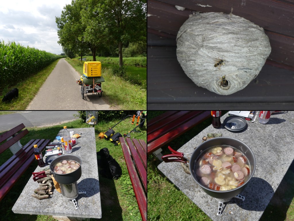 Jedoch ist wenige hundert Meter später wieder Schluss. Ich entdecke einen Spielplatz, an dem mehrere Bänke mit Tischen samt Mülleimer stehen. Sogar ein Bach grenzt hier an. Hier werde ich mir mal etwas kochen. Sonst habe ich das alles umsonst mitgeschleppt. So geselle ich mich zu einem Seniorenpaar, das ebenfalls pausiert. Neugierig werde ich beobachtet, wie ich all meine Utensilien herauskrame, die ich für mein Vorhaben benötige. Die eine und andere Frage beantworte ich bereitwillig. Besonders mein Kocher hat es ihnen angetan. Nicht das erste Mal, dass dieser besondere Aufmerksamkeit bekommt. Schnell noch zu den Bäumen in der Nähe gelaufen und etwas Bruch- und Totholz aufgesammelt. Als das dann in handliche Stücke gebrochen ist, geht es los. Das Pärchen ist unterdessen weitergeradelt und hat mir noch viel Glück bei meiner weiteren Reise gewünscht. So kann ich mich auf dem ganzen Tisch ausbreiten. Die Kartoffeln geschält und mit einer Handvoll Nudeln in den Topf. Pilze und Wurst hinterher und dann beim Köcheln zugeschaut. Zum Schluss noch ein Brühwürfel drauf und mit etwas Salz und Pfeffer verfeinert. Perfekt. Welch ein Gaumenschmaus. Und so einfach. Das mache ich eigentlich auch viel zu selten. Kann daran liegen, dass immer so zwei, drei Stunden ins Land ziehen, bis man alles wieder sauber und verpackt hat.
