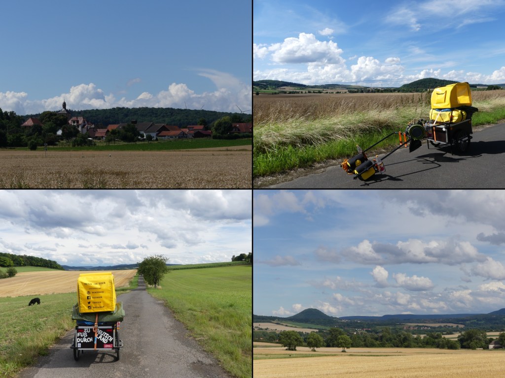 Nachdem ich in Reinshof in einer Bushaltestelle gesessen und gefrühstückt habe, geht es weiter. Die folge der Bundesstraße nach Niedernjesa. Dort klingel ich ein weiteres Mal und frage nach ein paar Liter Leitungswasser. Man weist auf einen Wasserhahn an der Fassade hin. Ansonsten wirkt der Herr recht kühl. Wie dem auch sei. Ich bekomme, was ich brauche. Darauf kommt es an. Wieder auf dem Fahrradweg hält ein Radler neben mir. Zusammen gehen wir ein paar Meter. Ich beschreibe einige meiner bisherigen Erlebnisse und was ich noch so vorhabe. Meint er, dass er aus Göttingen kommt und einst einem Radreisenden Unterschlupf gewährt hat. Zusammen habe man einen ausgelassenen Abend verbracht. Das hätte ich gestern auch gebraucht, gebe ich zu verstehen. Aber egal. Es ist jetzt, wie es ist und alles gut. Noch schnell nach einem Supermarkt gefragt, dann trennen sich unsere Wege wieder.