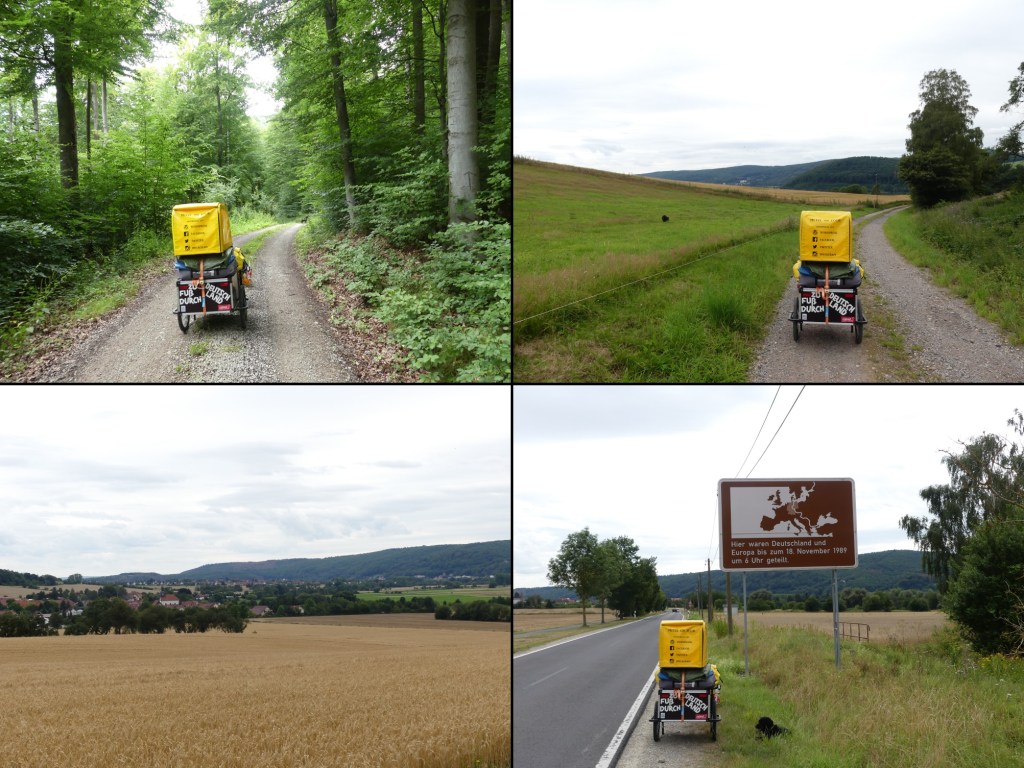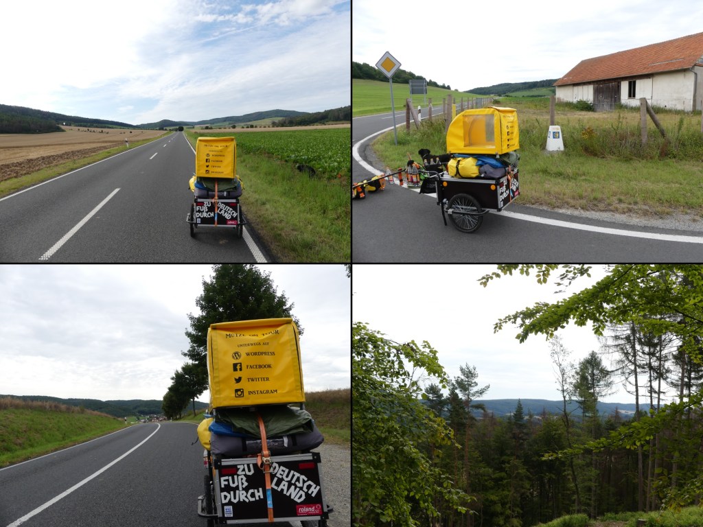 Ich treffe ein Pärchen, das mit seinem Hund unterwegs ist. Wir haben den gleichen Weg und so gehen wir einige Meter zusammen. Ich erkundige mich ein zweites Mal nach der Wegbeschaffenheit. Alles geschottert. Kein Grund für Sorgenfalten. Zumindest auf dieser Seite nicht. Wie ist das jetzt gemeint? Drüben, im Werratal ist der Abstieg steiler. Aber auch Wirtschaftsweg, dass Autos dort fahren können? Ja. Dann ist alles lässig. Ich beiß mich da schon durch. Und so geht es an den Anstieg. Auf längere Strecke geht es jetzt nach oben. Seit der zweiten Etappe merke ich jetzt wieder so richtig, wie viel Gepäck ich eigentlich dabei habe. So greife ich auf einen Trick zurück, den wir mal in Österreich von einem Bekannten gelernt haben. Meine Schrittlänge reduziert sich um zwei Drittel. Dazu bewege ich mich jetzt wie eine Schildkröte. So langsam setze ich die Schritte. Ein Schwingen des Anhängers ist nicht mehr spürbar. Ich habe es mir schlimmer vorgestellt.