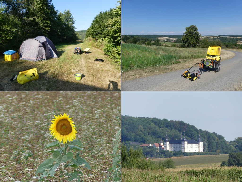 Hinter Oberessfeld entdecke ich in der Ferne ein weißes Schloss. Schloss Sternberg, wie ich später herausfinden soll. Also ein Foto geschossen, ehe ich weiter gehe. Lust habe ich keine mehr. Der Temperaturen heute sind jenseits der dreißig Grad. Ich möchte nicht mehr. Doch wo niederlassen? Ich werfe einen Blick auf mein Navi. Dann auf mein Telefon. Im nächsten Dorf soll es ein Wirtshaus geben. Das wäre doch zum Tagesabschluss nochmal schön. Ein kühles Bierchen. Oder hier irgendwo das Zelt hinbauen? Nein, Bierchen! Lauf weiter. Zwei Kilometer noch. Nach dem gestrigen Tag, ach, der gesamtbetrachteten Strecke: ein Steinwurf.