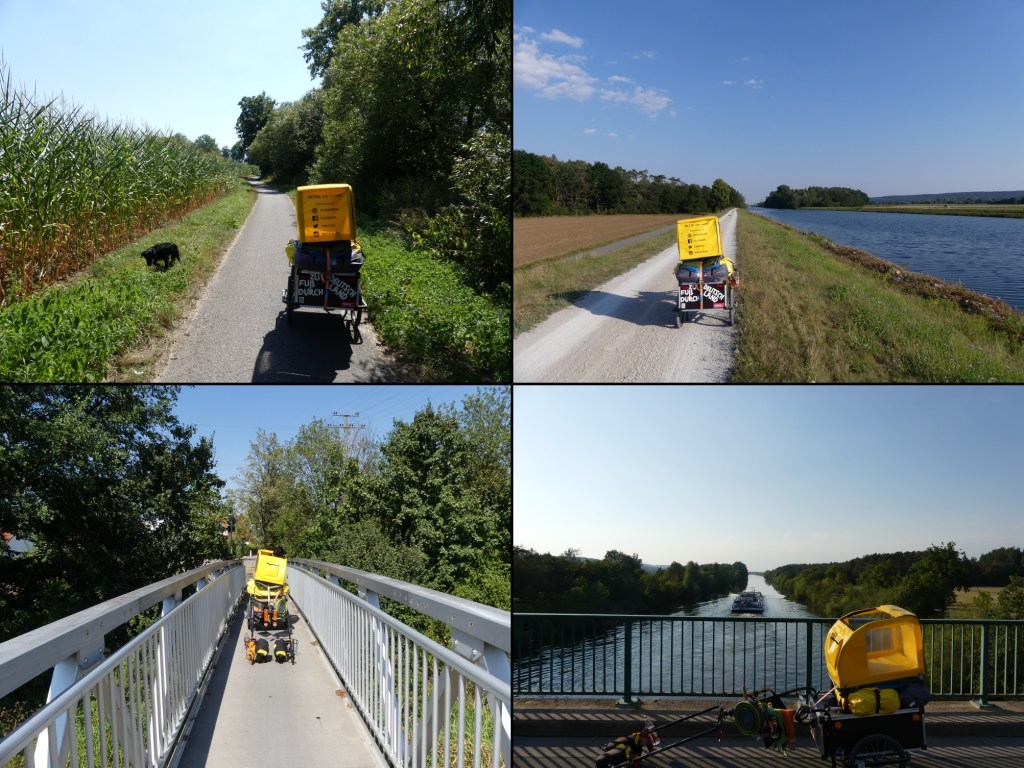 Als wir zur Kaffeezeit weiter ziehen, hangeln Lotte und ich uns von Schattenplatz zu Schattenplatz. Es ist unsäglich warm. Durch den Gedanken, dass ich bald am Main-Donau-Kanal laufen werde, wirkt das Ganze gleich noch einmal so gemein. Es ist wieder so ein Weiterschleppen. Man hat keine Lust sich auch nur ansatzweise zu bewegen, quält sich aber dennoch weiter.
