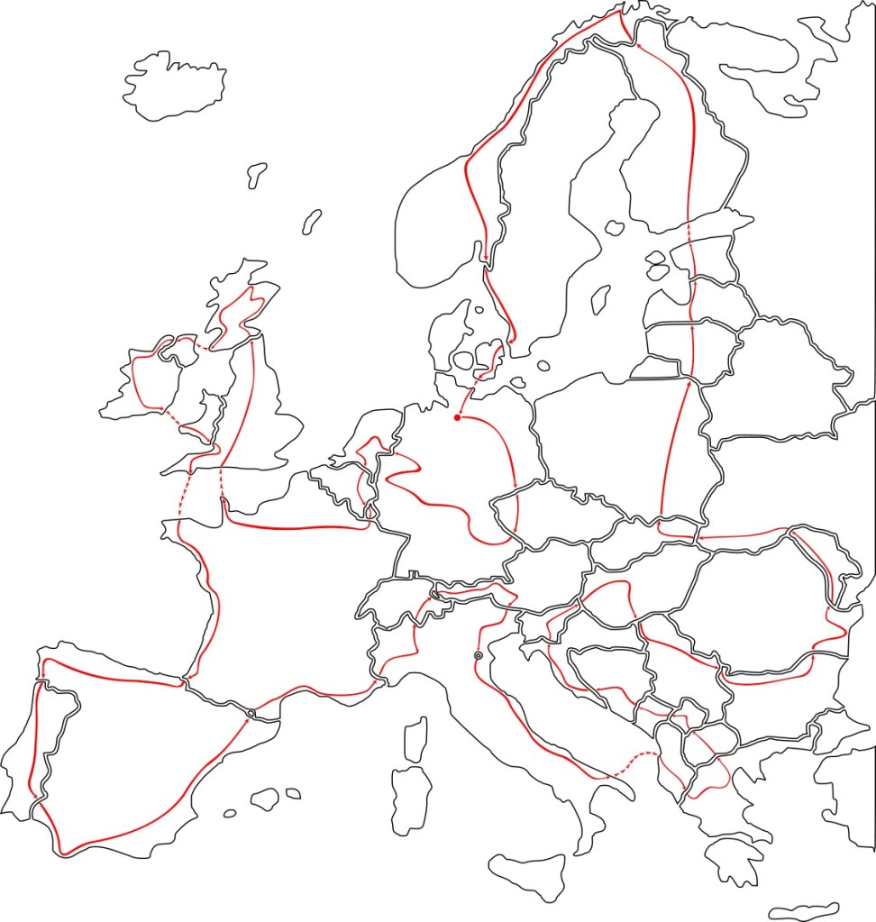 Wenn ich zurückdenke, wie ich ganz grob eine Linie auf einer Europakarte gezeichnet habe. Noch keine konkreten Gedanken als solches. Nur, dass ich dort einmal entlang radeln möchte. Oder besser, laufen. Schon ein bisschen verrückt. Bekloppt. Oder was man an dieser Stelle dazu sagen möchte. Ein kleiner Kiesel, der ins Rollen geriet. Mittlerweile rumpelt eine gigantische Gerölllawine durch meinen Kopf. Tausende Ideen. Gepaart mit Bedenken. Fragen, was ich an Equipment dabei haben sollte. Auf was kann ich verzichten? Aber da weiche ich jetzt vom Thema ab. Die Ausrüstung bekommt einen eigenen Beitrag. Nun erst einmal die Route. Zuerst ganz grob, wie alles mit einer Linie auf der Karte begonnen hat. Auf dann also: